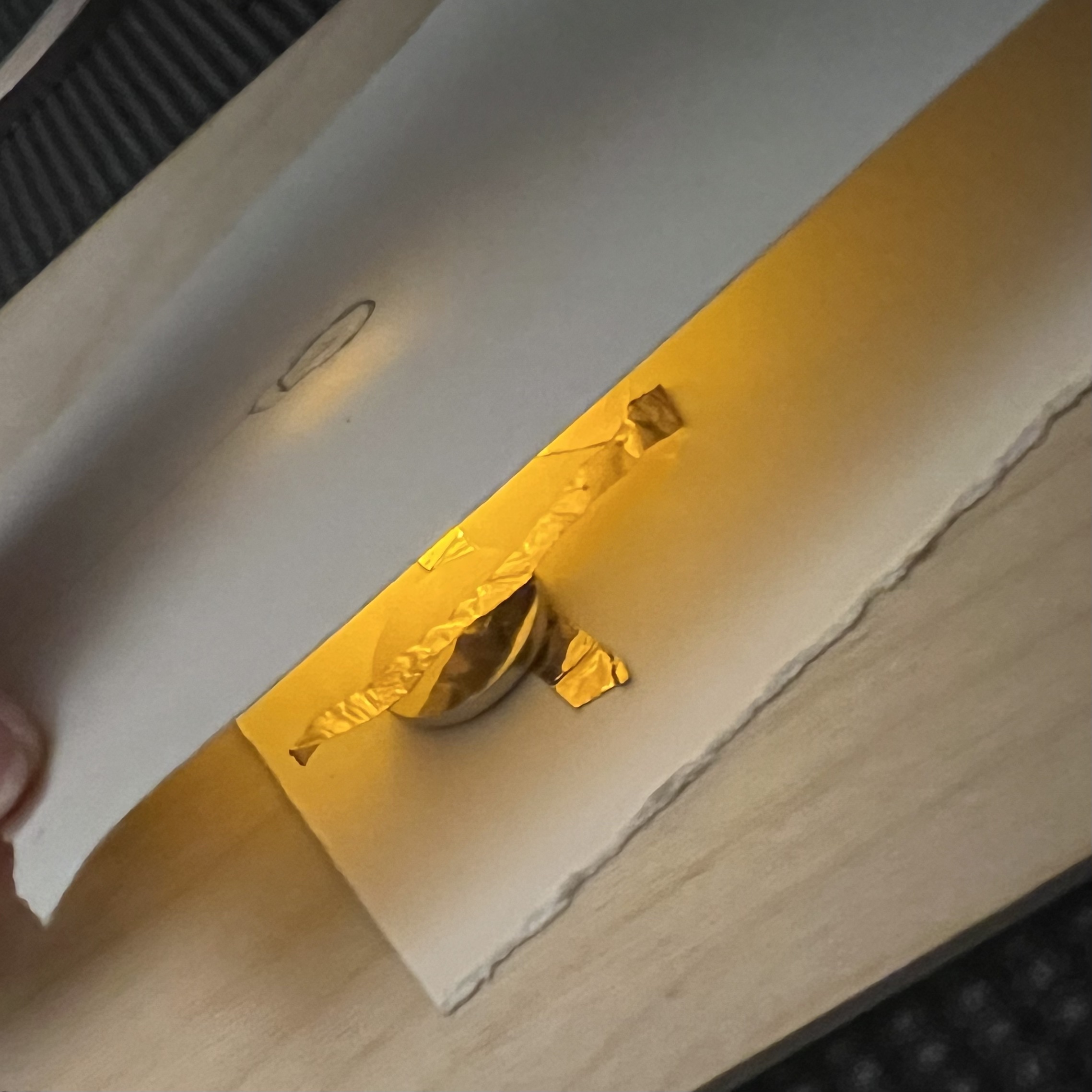 The final design incorporates a paper bookmark that lights up through the hole when closed. It can serve as a bookmark, book light, and even a flashlight. It uses a simple circuit made with copper tape and a coin cell battery. The circuit works when the battery is placed at the inside fold of the bookmark and can be secured with a string with the hole made in the center.