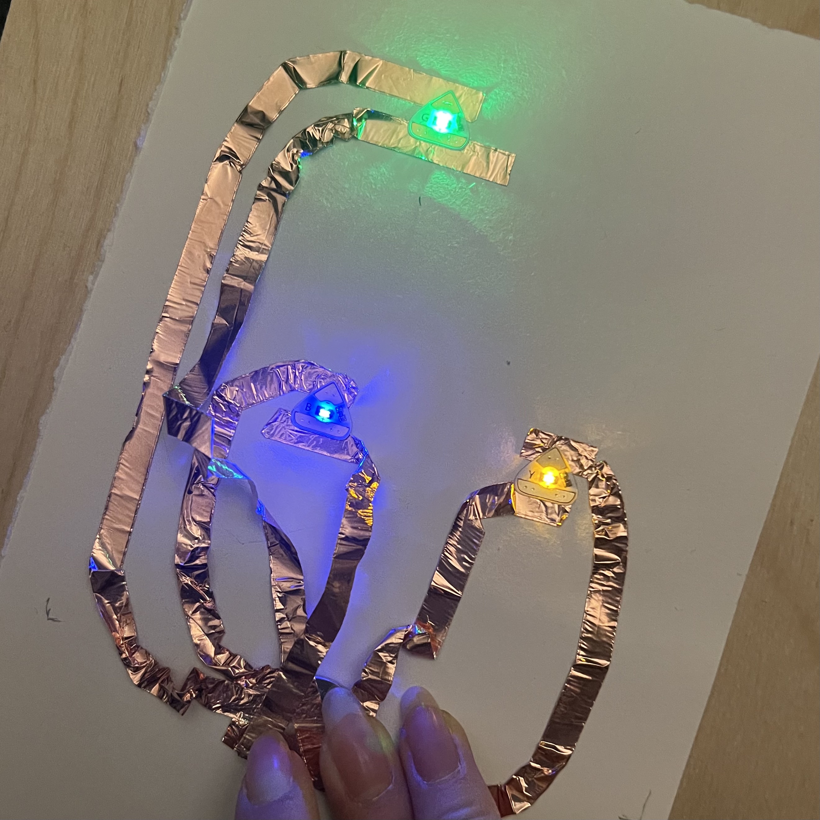 Cicuit made following Module 1 Tutorial Cicuit made following Module 1 Tutorial Holiday card with a 'press here' button that would light up on click Circuit made on another holiday card with the same dimensions. Copper tape was not being conductive on this material Circuit re-made on cardboard, producing better results Only blue LED would work, red LED had trouble being conductive Lightbulb drawn on a piece of paper Circuit made using yellow LED light Yellow LED light gives the allusion of a lit up light bulb Wrapping paper that will light up behind trees and car Circuit made using copper tape, LED lights, battery and a paper base Green and yellow LED lights work, red LED light still not being conductive Wrapping paper lit up behind trees and car Wrapping paper lit up behind trees and car Fabric cut into flowers Circuit made using copper tape, LED ligths, battery and a paper base Circuit made using copper tape, LED ligths, battery and a paper base LED lights underneath batting material Fabric flowers on top of fabric that gives off a glowing effect to the flowers Fabric flowers on top of fabric that gives off a glowing effect to the flowers